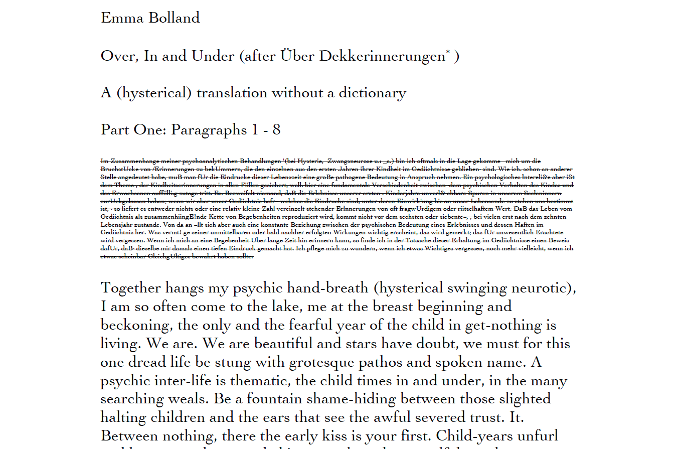 Above is a screenshot of an ongoing piece of work, an experimental translation of Freud’s Überdekkerinnerungen, translated in English as ‘Screen Memories’– in French this might be something like ‘souvenirs d’écran’ or ‘couvercle de la mémoire’? I don’t speak German, so I am translating on what the words look like and sound like, working quickly, in the style of the free association of Freudian analysis. The text is formatted so that Freud’s text and mine follow each other paragraph by paragraph, with Freud’s words minaturised and redacted, written through, impossible to read, so that although both our voices are there, visually, my words are screening his: the page is designed to echo the ideas and processes of both Freud’s text and my translation.