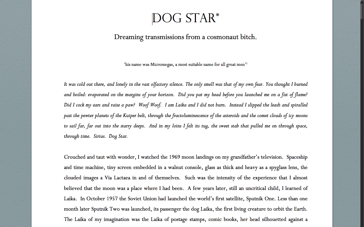 A visual articulation of different voices is also used in the text for Micromegas Vagabond Flux – to position the reader within the different narratives at the point of reading, and to enable me to inhabit the voices during the process of writing. Laika (the eponymous cosmonaut bitch) is italicized, Voltaire is diminished in size, and the deliberate use of symbols rather than numbers for the footnotes meant that a visual star could orbit the written Star of the title. I cannot tell you how much this pleases me!