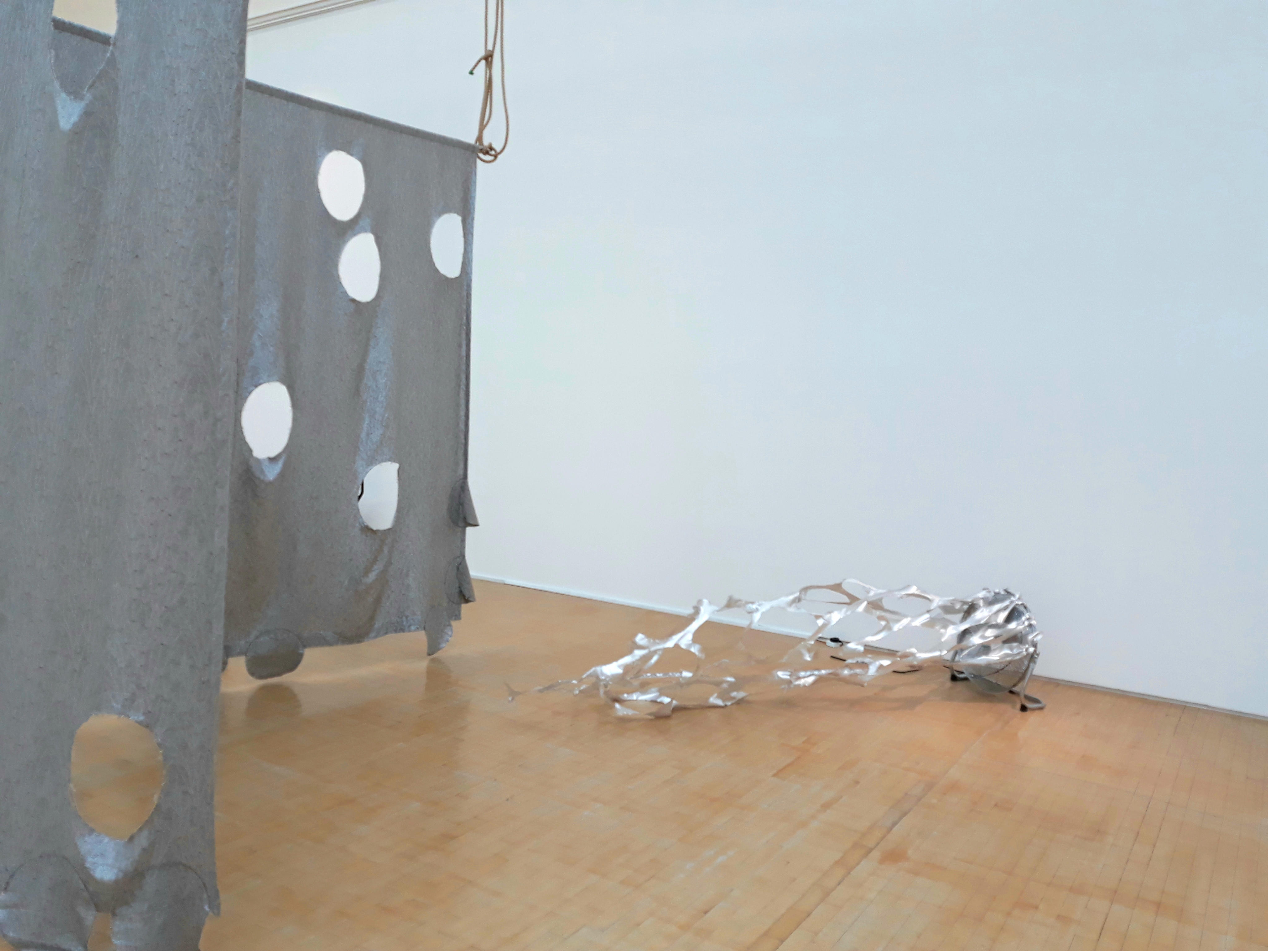 I go through and see on the floor a large silver fan, set near to the wall. Tied to the fan is a lattice of silver fabric, like liquid metal, a horizontal flutter, a shoal of small quick fish darting in the air. The curtains hang vertically, and they too are moving, but ever so slowly, almost imperceptibly, further from the wind. I attend to the curtains. The fabric is soft, but grainy, pewter, like unpolished metal, shot through with a glittery silver thread, and I think of the phrase ‘silver screen’. Here and there circles the size of large dinner plates are cut from the fabric, and the cut-out pieces are sewn around the curtains’ hems, some of them just brushing against the floor.